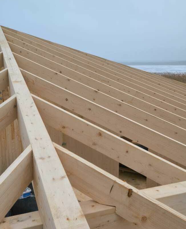 Классическая утепленная кровля Каркас кровли выполняется из сухой строганной доски шириной 195 мм, с перекрестным утеплением внутри. Если пролеты большие, то используется ЛВЛ–балка или клееный брус.