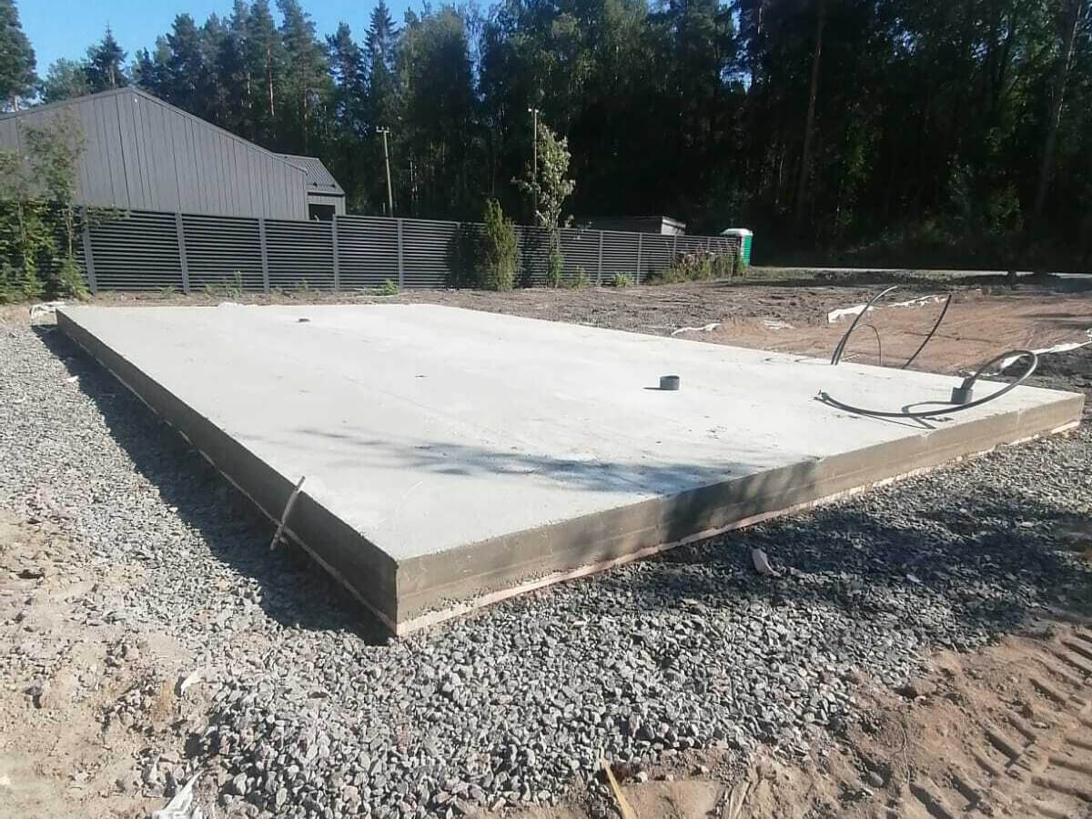 Железобетонная плита В качестве фундамента мы используем ж/б плиту толщиной от 200 до 300 мм. Плита сооружается на заранее подготовленный котлован, с отсыпкой песком, послойно трамбовкой и засыпкой щебнем. В качестве гидроизоляции используем объёмную мембрану, типа Planter. Арматура укладывается в опалубку на утеплитель высокой плотности, толщиной 50–100 мм. Вокруг плиты в обязательном порядке выполняется дренаж с установкой дренажных колодцев. Глубина котлована и количество песка и щебня (не входят в комплектацию теплый контур) определяется на основании геодезического исследования участка строительства. До устройства опалубки под фундамент заводятся все коммуникации и закладные детали.
